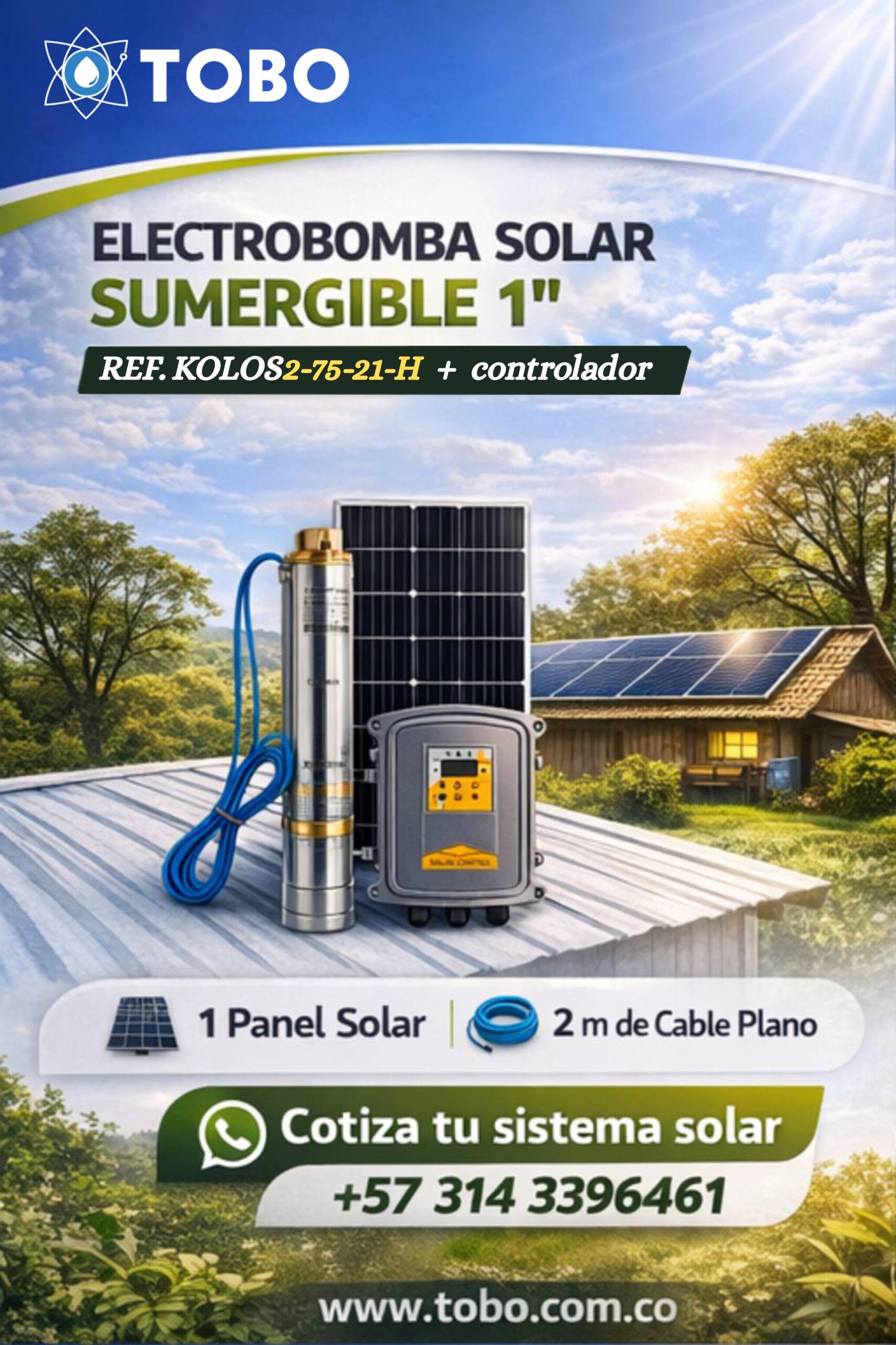 | INCLUYE | Electrobomba solar sumergible 1 1/4" KOLOS2-75-21-H + controlador, 1 Panel, 2 m de cable plano sumergible y kit de instalación. |